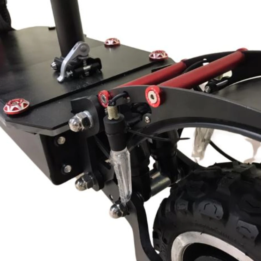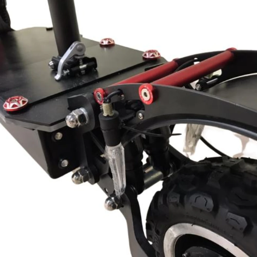Мощность 6000 Вт (два мотора по 3000 Вт) позволяет разгоняться до 85 км/ч и преодолевать подъемы до 30 градусов даже при полной нагрузке 150 кг, сохраняя стабильность на неровностях благодаря пневматическим 10-дюймовым колесам с протектором. Аккумулятор 60 В 38.4 Ач (литий-ионный) дает реальный пробег 60-90 км в Eco-режиме (экономия энергии за счет снижения скорости до 40 км/ч), 40-60 км в Drive и 30-50 км в Sport/Turbo при агрессивной езде; энергоэффективность повышается рекуперативным торможением, возвращающим до 10% энергии. Гидравлические дисковые тормоза с рекуперацией останавливают самокат за 3-4 метра с 50 км/ч; время зарядки 6-8 часов от двух 3А-зарядок, без быстрой опции, но параллельная зарядка сокращает ее вдвое.​