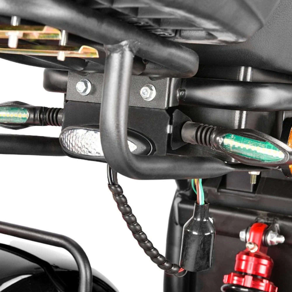 Трехколесный вариант электроскутера оснащен большими устойчивыми колесами, широким мягким сиденьем и вместительной кофрой. Техника оснащена всем необходимым для активного время провождения, поездки на рыбалку или другой вид отдыха.