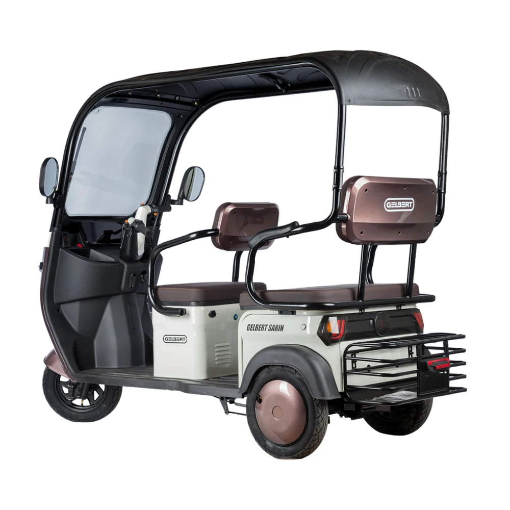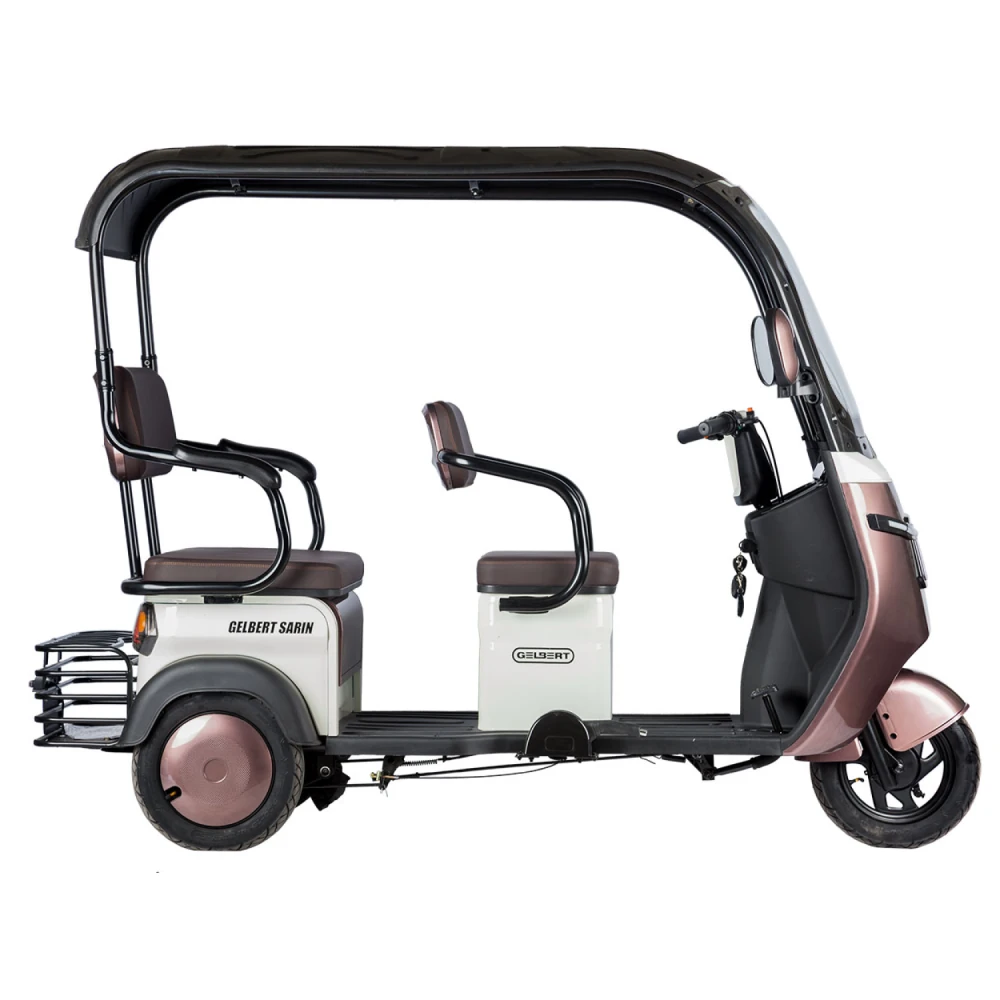 2. Модель Rutrike Gelbert Sarin — трехколесный электротрицикл с мощным двигателем 1000 Вт и возможностью выбора аккумулятора с напряжением 48 или 60 В. Это устойчивый и надежный транспорт, предназначенный для комфортного передвижения по городу и пригородам. Модель оснащена крышей и зеркалами заднего вида, что повышает безопасность и комфорт при эксплуатации.