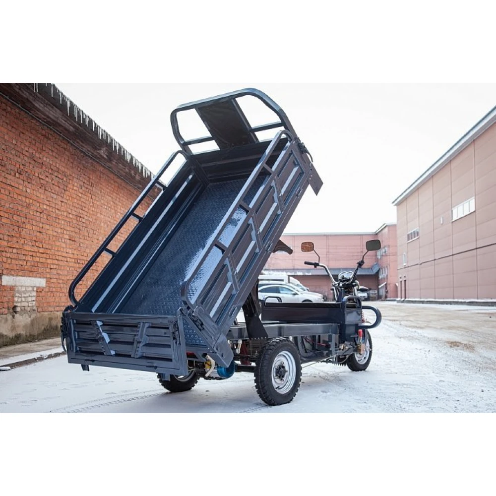 Грузовой электротрицикл Rutrike Титан 2000 гидравлический 60В 1500Вт с гидравлическим подъемным механизмом по внешнему виду напоминает мини-самосвал, технику для коммерческих целей. При параметрах мощности 1500 Вт электрогрузовичок способен транспортировать 1200 кг, развить скорость до 25 км/час и на одной подзарядке преодолеть 80 км пути.
